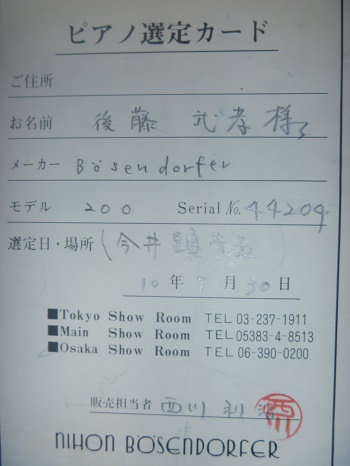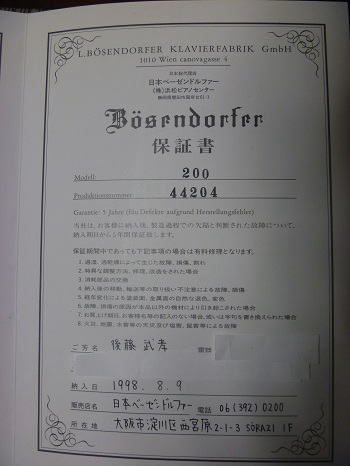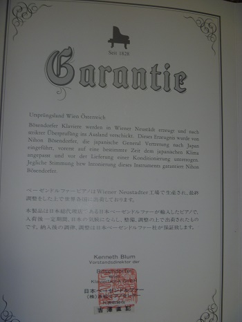 ベーゼンドルファー社保証書表紙 ベーゼンドルファー社保証書 べ―ゼンドルファー社保証書 ウィーン国立音楽大学名誉教授今井顕氏によるベーゼンドルファー200選定カード |