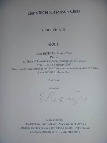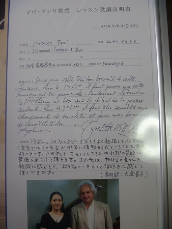 動画はこちら 2014年9月6日 イブ・アンリ氏マスタークラス受講証明書 |