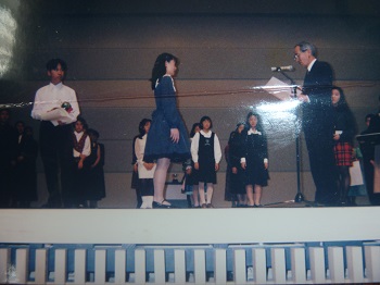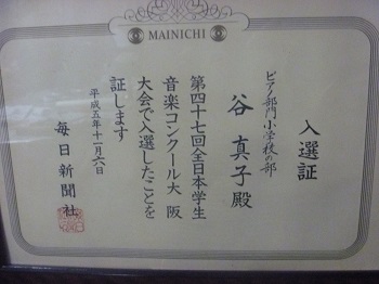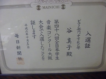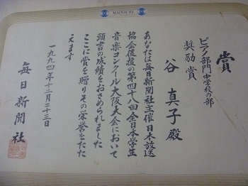 中1 「第48回全日本学生音楽コンクール大阪大会中学校の部入賞者演奏会場ロビーにて 「恩師 片岡みどり先生と」 第48回全日本学生音楽コンクールピアノ部門 大阪大会中学校の部 入選証 同上コンクール大阪大会中学校の部入賞賞状 同上コンクール大阪大会中学校の部トロフィー 同上コンクール大阪大会中学校の部表彰式(撮影:毎日新聞社) 全日本学生音楽コンクール大阪大会本選プログラム歴代入賞者一覧より 同上コンクール課題曲 予選 「バッハ イタリア協奏曲 BWV971 第2楽章より」 先生のご注意や自分の研究した楽譜への書き込み 音源はこちら 同上コンクール課題曲 本選 「ショパン スケルツォ第1番 Op.20 h-moll」 先生のご注意や自分の研究した楽譜への書き込み 音源はこちら 「中学生 故片岡みどり先生による直筆レッスンの記録」 |